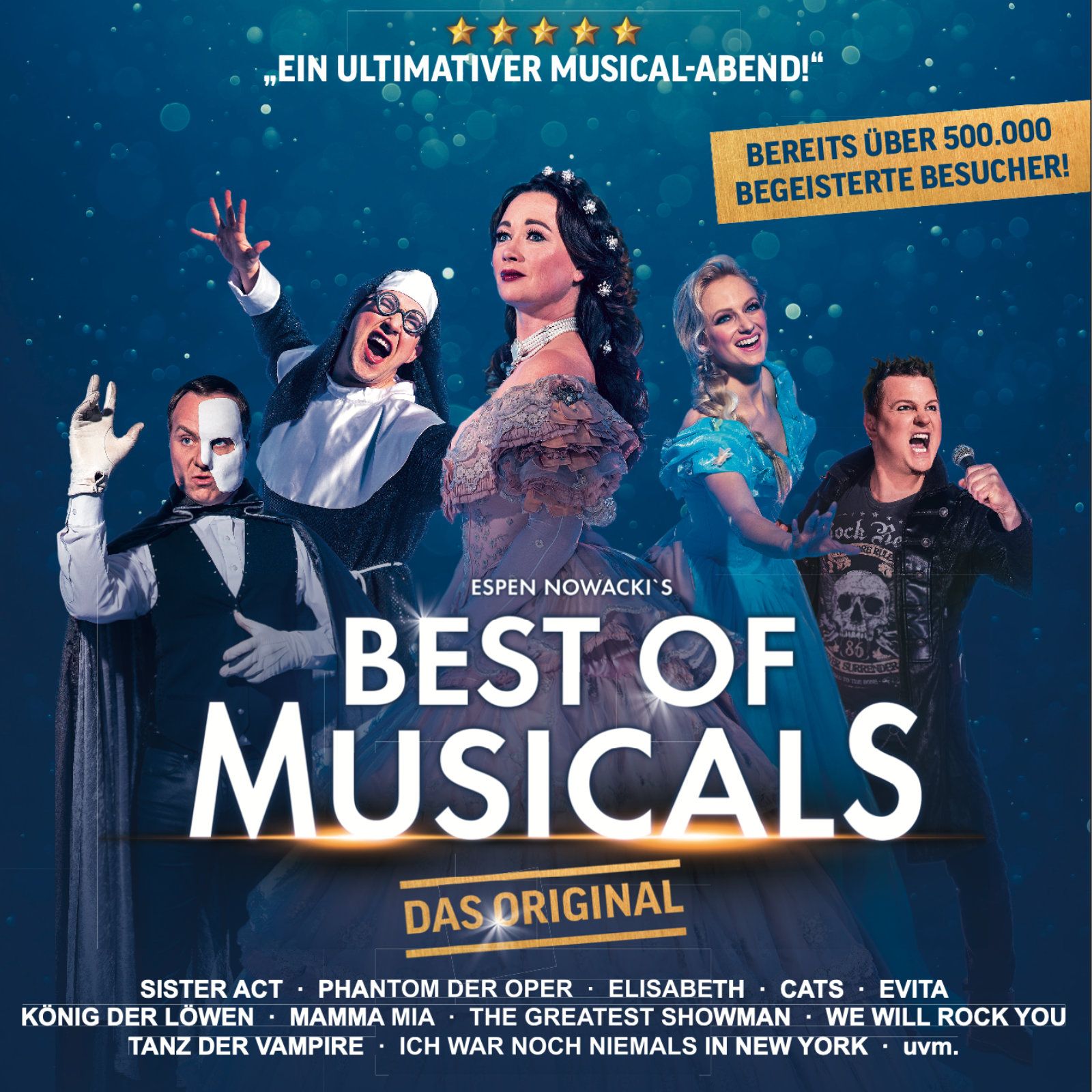 Das Publikum erlebt einen Streifzug durch gefühlvolle Balladen bei EVITA oder ELISABETH, mitreißende Hits aus den Musicals GREASE und MAMMA MIA sowie bei WE WILL ROCK YOU. Die Top-Solisten lassen keine Wünsche offen und vereinen auch moderne Stücke wie DIE EISKÖNIGIN, SISTER ACT und KÖNIG DER LÖWEN zu einem fesselnden Gesamtkunstwerk. Höhepunkte wie die unvergleichbaren Songs von TANZ DER VAMPIRE oder der Klassiker das PHANTOM DER OPER lassen die Besucher innehalten und sorgen für Gänsehautmomente.